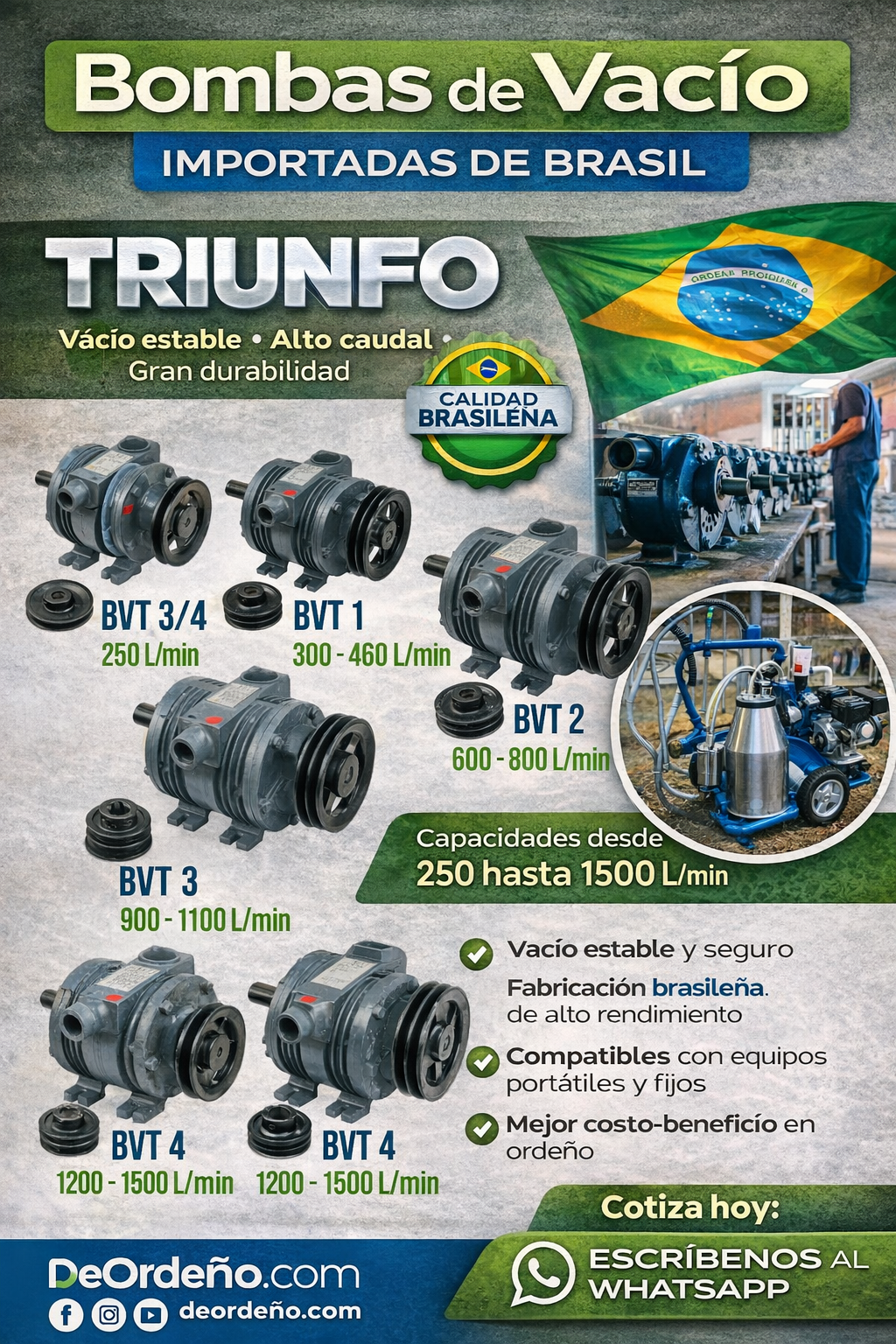 Las bombas de vacío TRIUNFO (Brasil) están diseñadas para ofrecer vacío estable, alta durabilidad y excelente rendimiento en equipos de ordeño portátiles y salas de ordeño. Son reconocidas por su tecnología de punta, materiales resistentes y costo-beneficio superior, ideales para trabajo continuo en el campo colombiano.