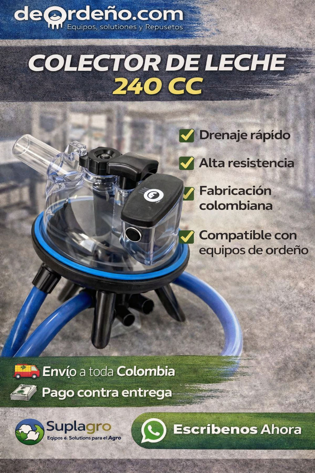 El Colector de Leche para Ordeño 240 cc de fabricación colombiana está diseñado para productores que buscan mayor durabilidad, flujo rápido de leche y máxima higiene durante el ordeño mecánico. Fabricado en polisulfona de alta resistencia, este colector permite drenar la leche de forma eficiente, reduciendo el tiempo de ordeño y evitando acumulaciones que afectan el rendimiento del equipo.