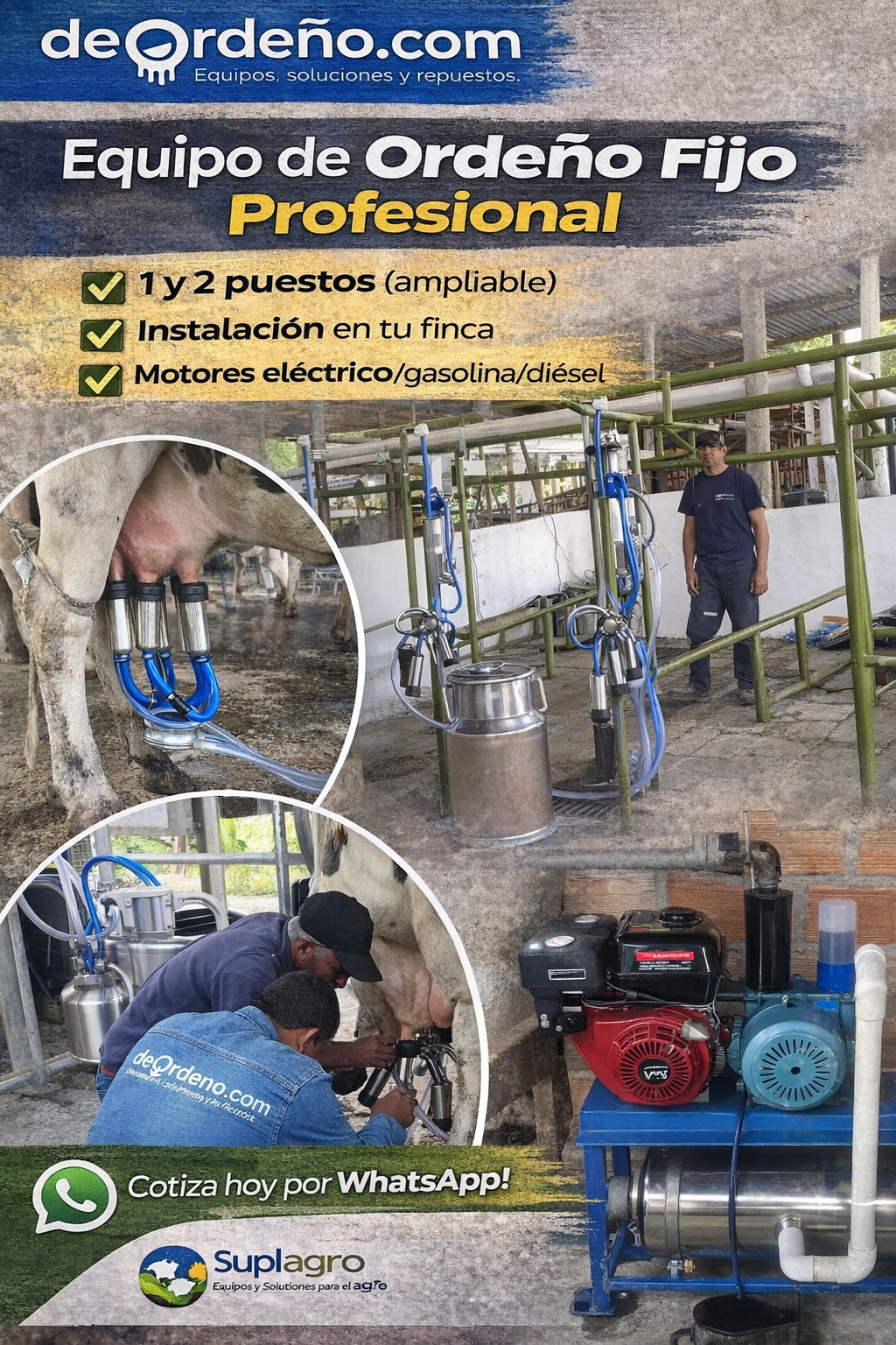 En Suplagro / DeOrdeño.com diseñamos e instalamos equipos de ordeño fijo a la medida, con asesoría técnica, capacitación y envíos/instalación en todo el país.