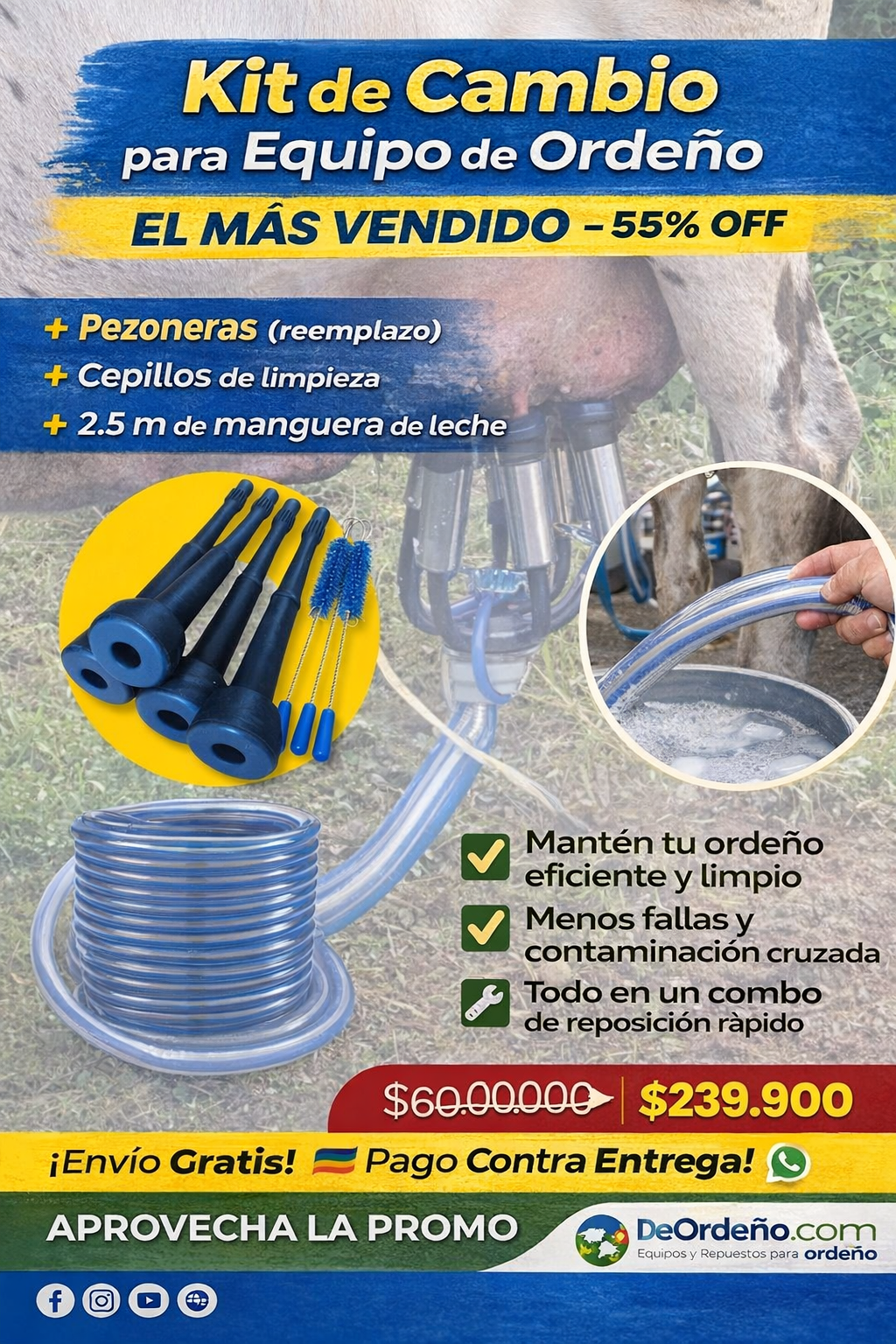 Mantén tu equipo de ordeño en óptimas condiciones con el Kit de Cambio para Equipo de Ordeño, el combo más vendido para reposición y mantenimiento preventivo. Incluye pezoneras, cepillos de limpieza y 2.5 metros de manguera de leche, todo lo necesario para mejorar la higiene, el flujo de leche y el bienestar animal en un solo paquete.