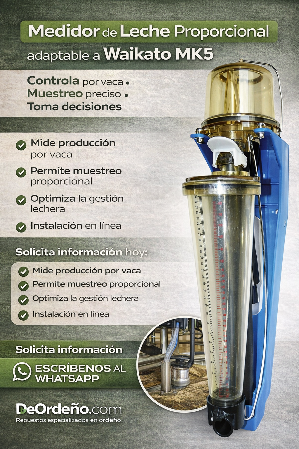 "No pierdas más tiempo. ¡Eleva la productividad de tu granja y toma el control con el Medidor de Leche Proporcional adaptable a Waikato MK5! Contáctanos hoy para más información."