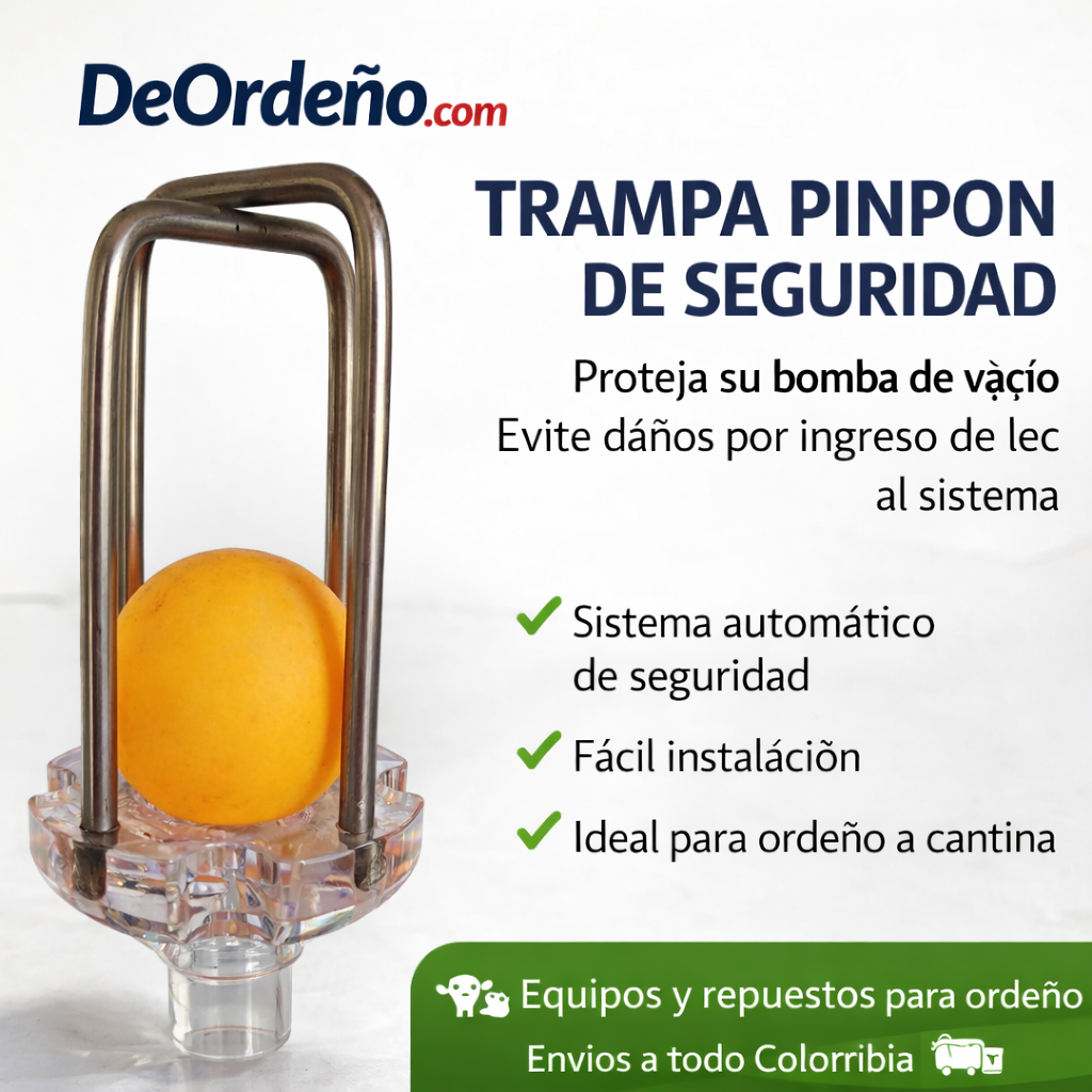 La Trampa Pinpon de seguridad para ordeño a cantina es un dispositivo diseñado para proteger la bomba de vacío del equipo de ordeño, evitando que la leche o líquidos ingresen al sistema de vacío.